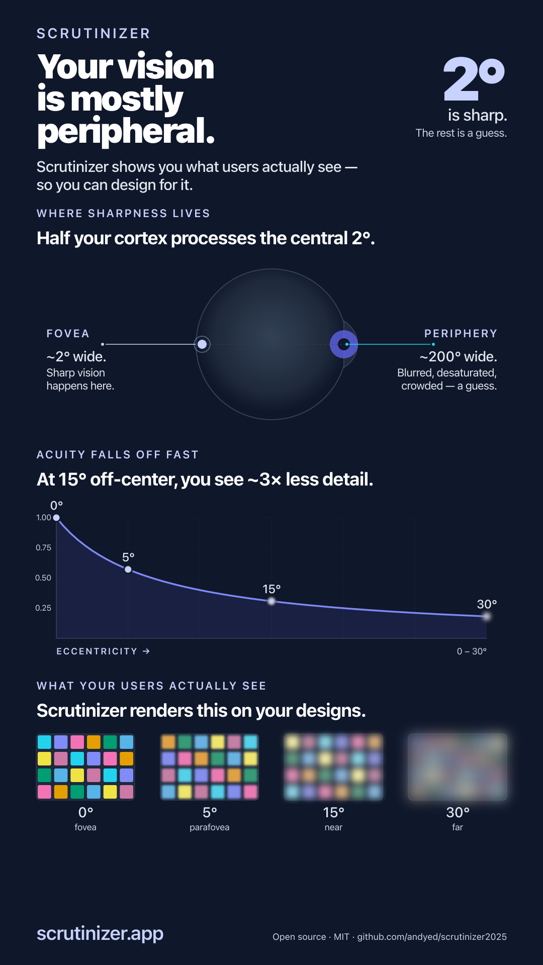 Scrutinizer foveation explainer: only 2° of your visual field is sharp. The rest is peripheral — blurred, desaturated, crowded. Scrutinizer renders this on your designs.